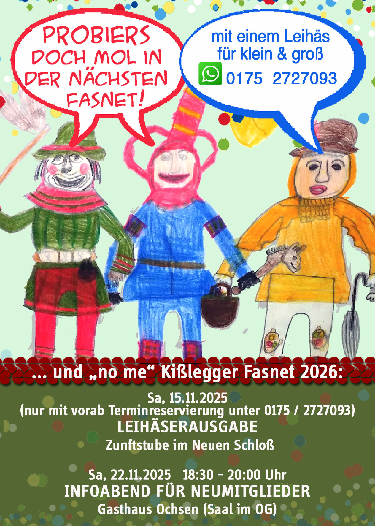Für alle kleinen und großen Hudelmale und Reitenderle (oder die es gerne werden wollen), die noch kein eigenes Häs besitzen, findet am Samstag, 15. November in der Zunftstube im Neuen Schloss die Leihhäser-Ausgabe statt. Eine vorherige Terminvereinbarung ist unbedingt notwendig. Setzt Euch hierfür mit unserer Zeugmeisterin Ute Lutz in Verbindung.